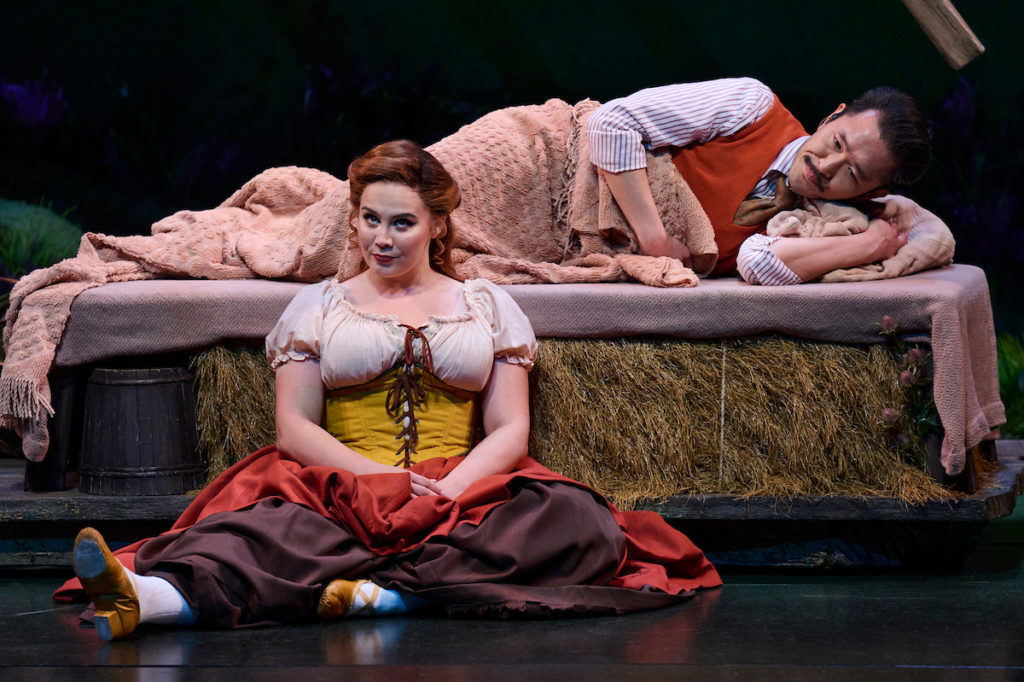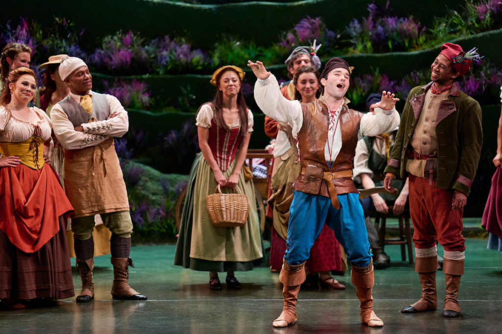 - Choreography: Katy Tabb’s folk choreography brought charm to moments like the wedding scene, with dancers more concerned with footwork than their arms in a style that evoked both the Irish step dancing from Legally Blonde: The Musical and the lovely movements of The Sound of Music’s “Ländler.” However, the stage felt cramped for the large cast’s dance in “I’ll Go Home with Bonnie Jean.”