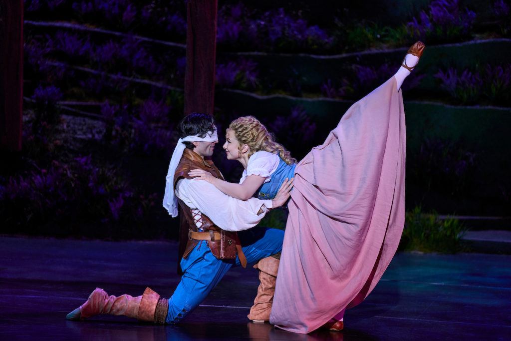 - Golden Age Style: The production captured the essence of Golden Age musicals through its vocal styling. Jessica Skerritt’s vibrato soared like a bird in “Waitin’ for My Dearie” (supported by a beautiful trio of backup singers) and “From This Day On.” Daniel Velasquez demonstrated similar vocal prowess when singing “I’ll” in “I’ll Go Home with Bonnie Jean.” The rich tenor and baritone notes evoked the era’s signature sound as Harter Clingman brought warmth to “There But For You Go I” and “The Heather on the Hill.” Velasquez tenderly serenaded his love through a door in “Come to Me, Bend to Me.” Skerritt and Clingman’s duet on “Almost Like Being in Love” had genuine chemistry. When the full chorus swelled together, it was like the lush overtures of classic Disney films. Together, these moments transported the audience to the Golden Age of ole timey musical theatre.
