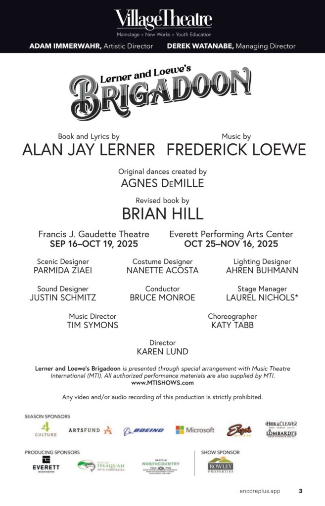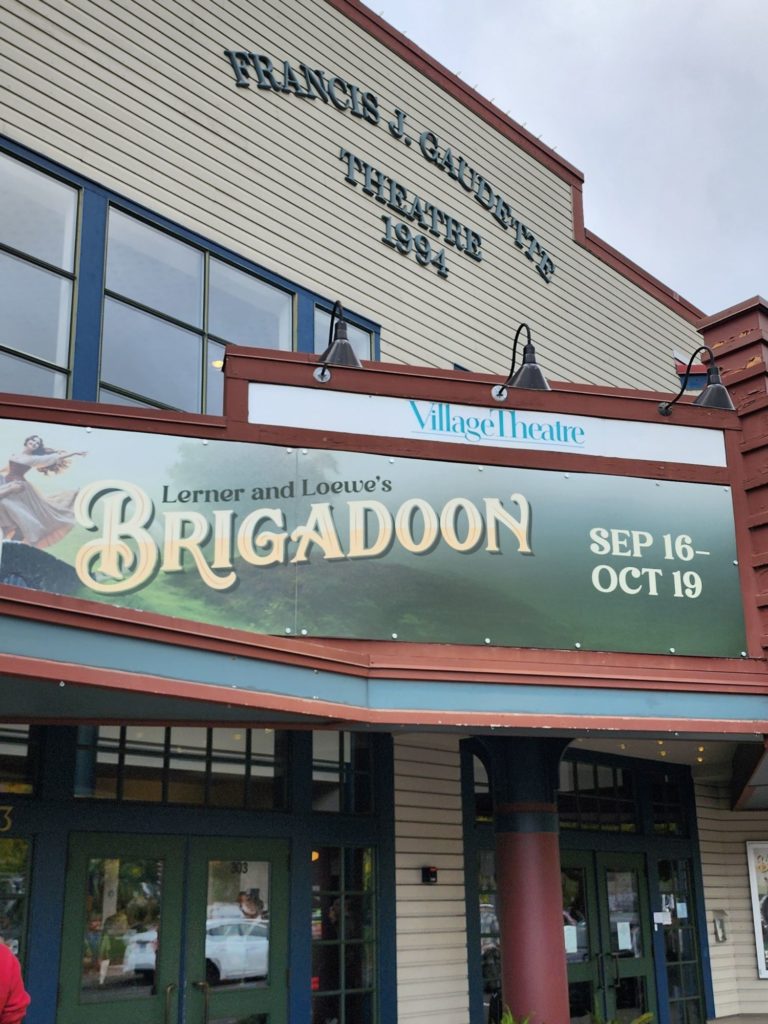 Elevator Thoughts (aka Tweet): Brigadoon at Village Theatre. Lush heather flower-covered hills motif by scenic designer Parmida Ziaei. Rich, soaring vocals in the classic golden-age musical style. Charming folk dances by Katy Tabb. Idyllic Scottish fantasy. See it before it closes 11/16/25!