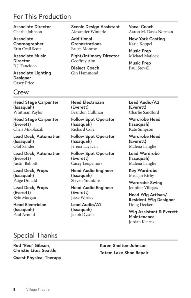 - Village Theatre’s Francis J. Gaudette Theatre: 303 Front Street North, Issaquah, WA 98027