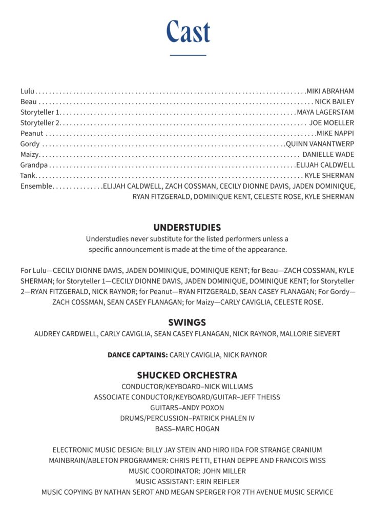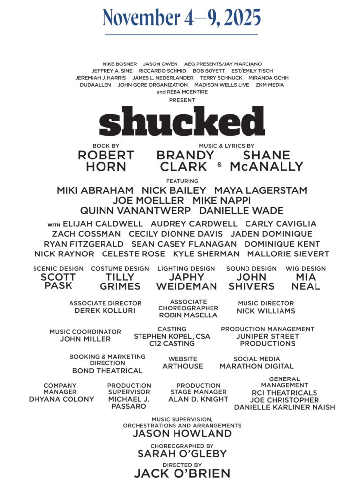 Synopsis from the Licensor or Theatre Company: Shucked is the Tony Award®–winning musical comedy The Wall Street Journal calls “flat out hilarious!” And nobody knows funny like economists. Featuring a book by Tony Award winner Robert Horn (Tootsie), a score by the Grammy® Award–winning songwriting team of Brandy Clark and Shane McAnally (Kacey Musgraves’ “Follow Your Arrow”), and directed by Tony Award winner Jack O’Brien (Hairspray), this corn-fed, corn-bred American musical is sure to satisfy your appetite for great musical theater.