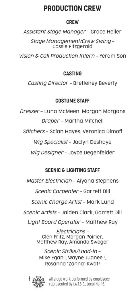 • Thrust Stage: As I noted in Taproot Theatre’s previous Sister Act, sitting literally on the sidelines of a thrust stage evokes a certain sense of FOMO. But I recognize the financial need to sell more seats to pay for a (non-profit) production. There should be a general theatre rule to discourage placing seats past one-third of the thrust stage sidelines.