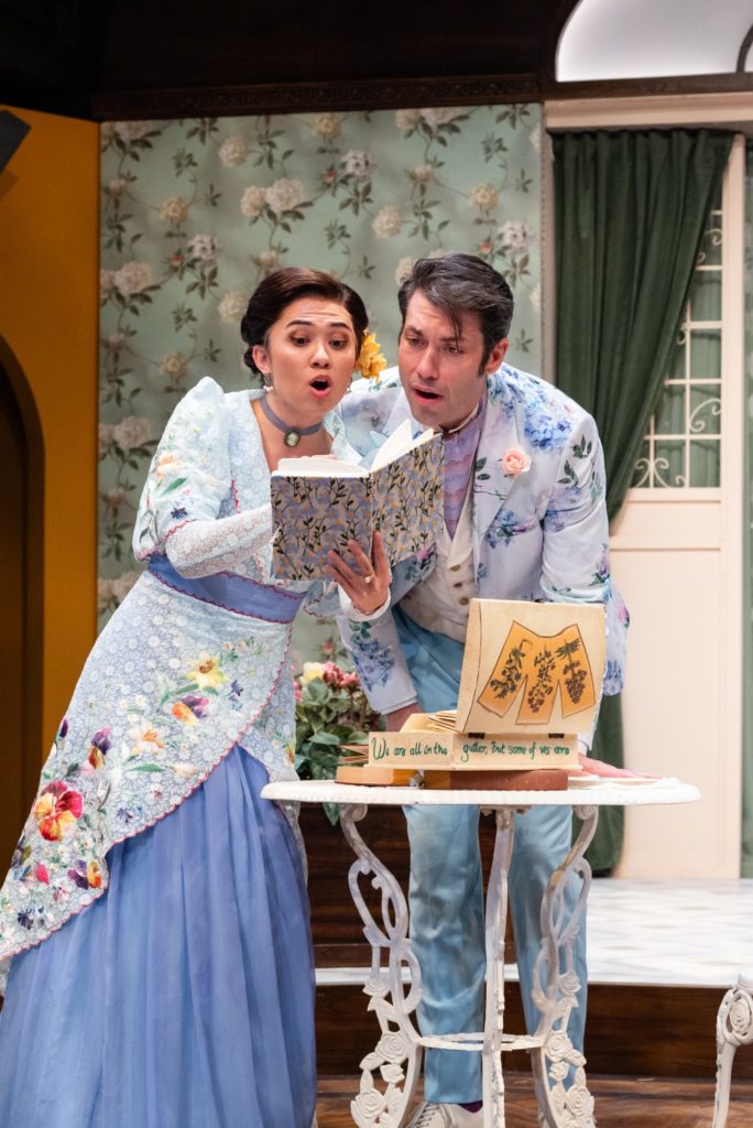 Alegra Batara as Cecily Cardew and Christopher Clark as Algernon Moncrief in The Importance of Being Earnest at Taproot Theatre (September 2025). Photo by Robert Wade.