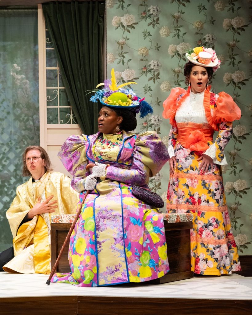 From left to right: Nik Doner as Reverend Chasuble, Shaunyce Omar as Lady Bracknell, and Kelly Karcher as Gwendolen Fairfax in The Importance of Being Earnest at Taproot Theatre (September 2025). Photo by Robert Wade.