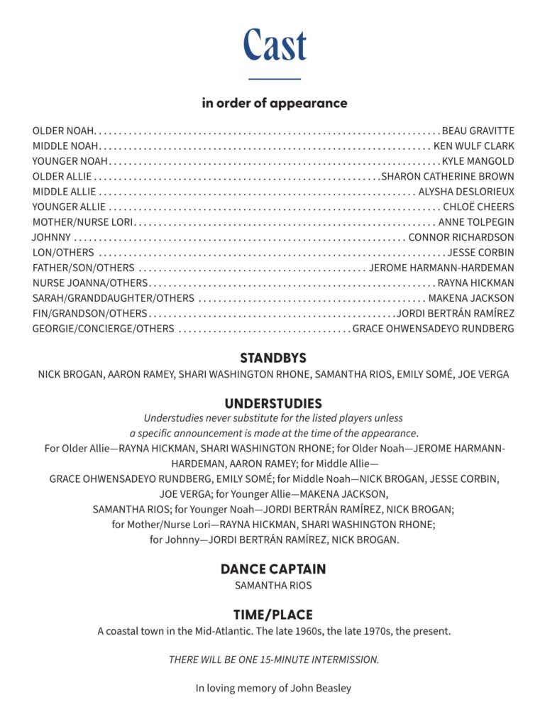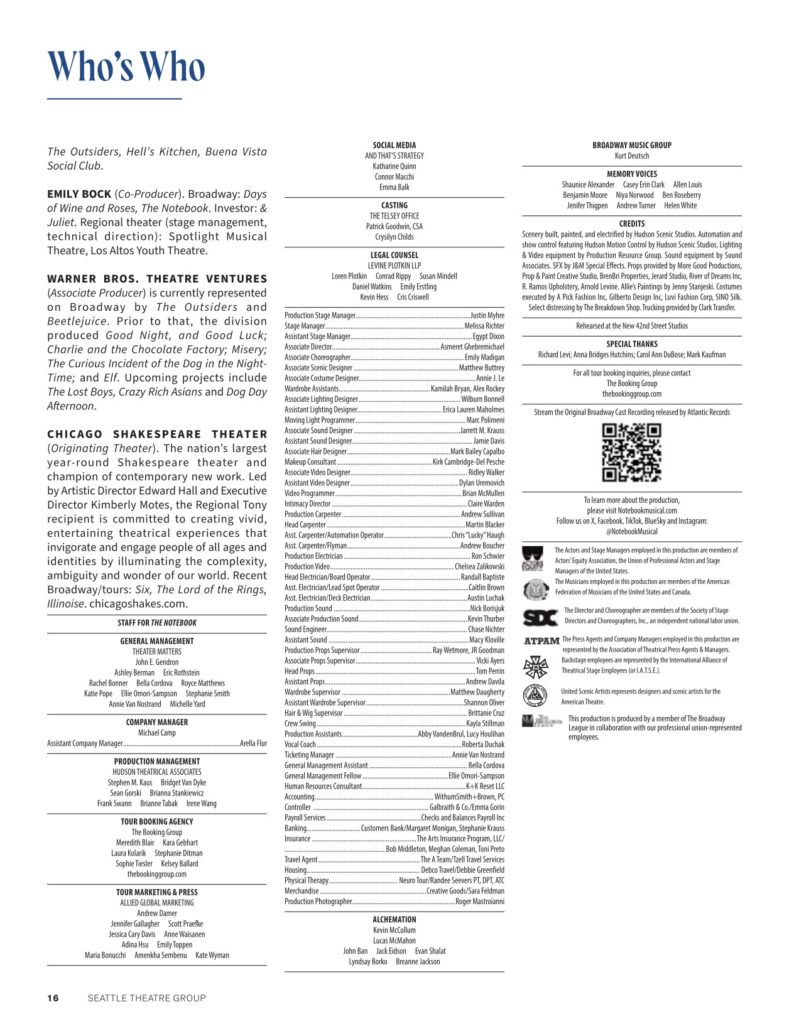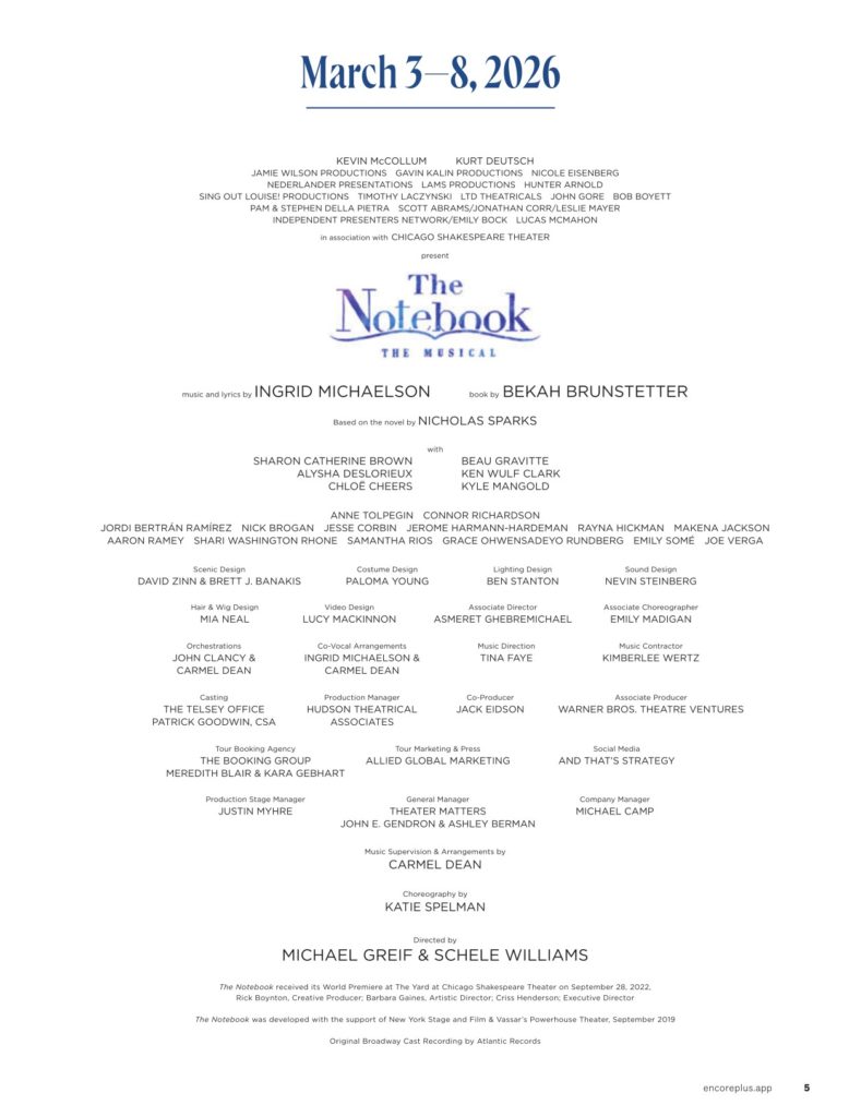 Synopsis from the Licensor or Theatre Company: Based on the best-selling novel that inspired the iconic film, The Notebook tells the story of Allie and Noah, both from different worlds, who share a lifetime of love despite the forces that threaten to pull them apart. “Full of butterfly-inducing highs and beautiful songs” (Entertainment Weekly), The Notebook is a deeply moving portrait of the enduring power of love. Chris Jones of The Chicago Tribune says The Notebook is “absolutely gorgeous, not to be missed,” and The New York Daily News calls it “a love story for the ages.” The Notebook is directed by Michael Greif and Schele Williams, and features music and lyrics by multi-platinum singer-songwriter Ingrid Michaelson, book by Bekah Brunstetter, and choreography by Katie Spelman