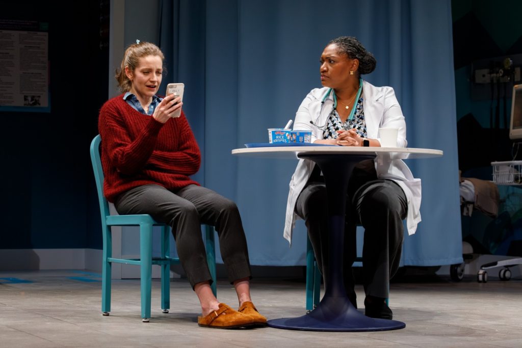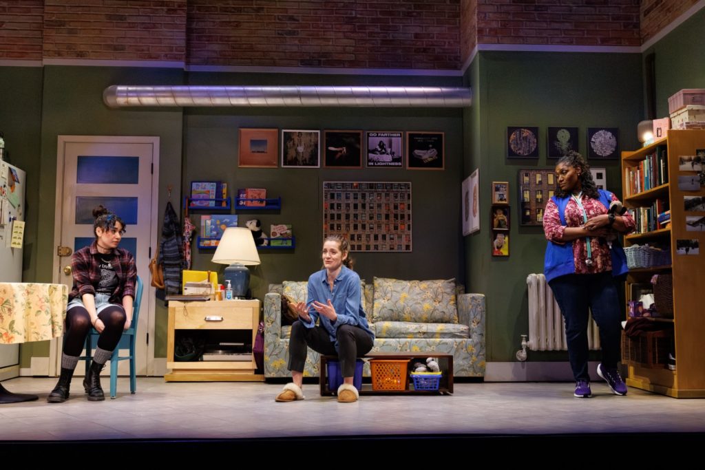 Stage Mechanics: Lately, I’ve noticed Seattle Rep has developed a real flair for transformative sets that make a statement through their movement. In this show, scenic designer Julia Hayes Welch conceptualized a dingy New York City apartment that opened up mid-play into a sterile hospital waiting area. It reminded me of the rotating stage in Seattle Rep’s previous Mother Russia and Blues for an Alabama Sky. Or the police car and rising patio wall in Seattle Rep’s Laughs in Spanish. It’s becoming a signature of the Seattle Rep’s productions.