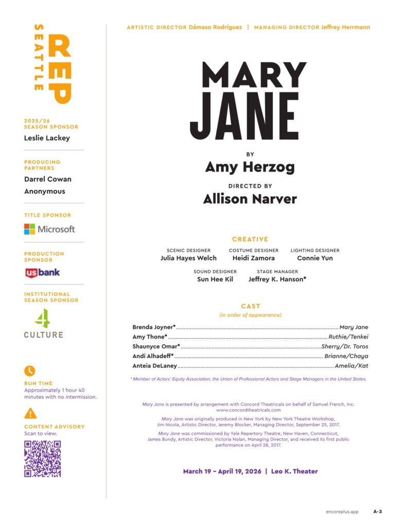 Brenda Joyner in MARY JANE (2026) at Seattle Rep. Lighting Design by Connie Yun. Photo by Sayed Alamy.Anteia Delaney, Brenda Joyner, and Shaunyce Omar in MARY JANE (2026) at Seattle Rep. Scenic Design by Julia Hayes Welch. Photo by Sayed Alamy.Brenda Joyner and Andi Alhadeff in MARY JANE (2026) at Seattle Rep. Photo by Sayed Alamy.Amy Thone and Brenda Joyner in MARY JANE (2026) at Seattle Rep. Scenic Design by Julia Hayes Welch. Photo by Sayed Alamy.Amy Thone and Brenda Joyner in MARY JANE (2026) at Seattle Rep. Photo by Sayed Alamy.Brenda Joyner and Anteia Delaney in MARY JANE (2026) at Seattle Rep. Costume Design by Heidi Zamora. Photo by Sayed Alamy.Brenda Joyner and Shaunyce Omar in MARY JANE (2026) at Seattle Rep. Photo by Sayed Alamy.