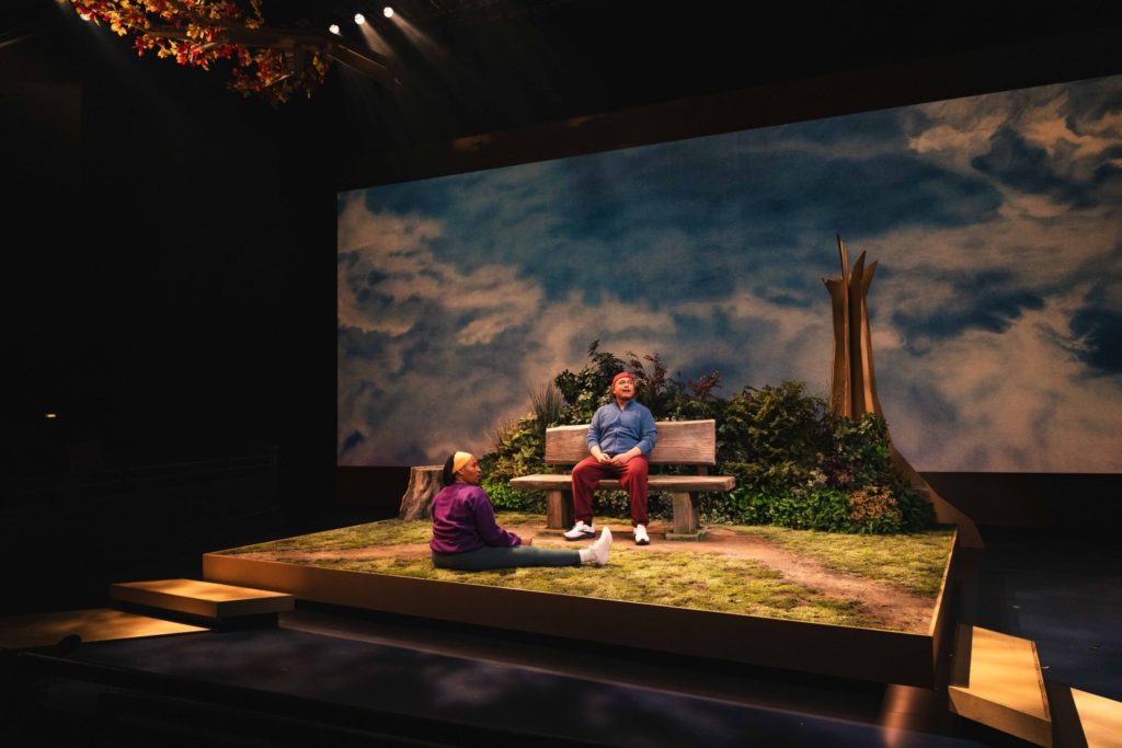Scenic designer LB Morse brought quiet ingenuity to the passage of seasons. Four tree branches hung above the stage, each illuminated in turn to mark green summer, gold autumn, a bare snowy winter, and cherry blossom spring. As the seasons shifted, leaves, snow, or petals drifted down to the stage and the spotlight illumination moved to the next season’s branch. However, it was puzzling that they skipped summer at the play’s end. Was that symbolic? And while the branches transformed beautifully overhead, the lush foliage at stage level remained unchanged, which wasn’t consistent against the stark, barren winter background projection. The park bench and surrounding greenery otherwise evoked an almost storybook aura between an idyllic pastoral impressionist painting and the saturated perfection of a Nintendo landscape.