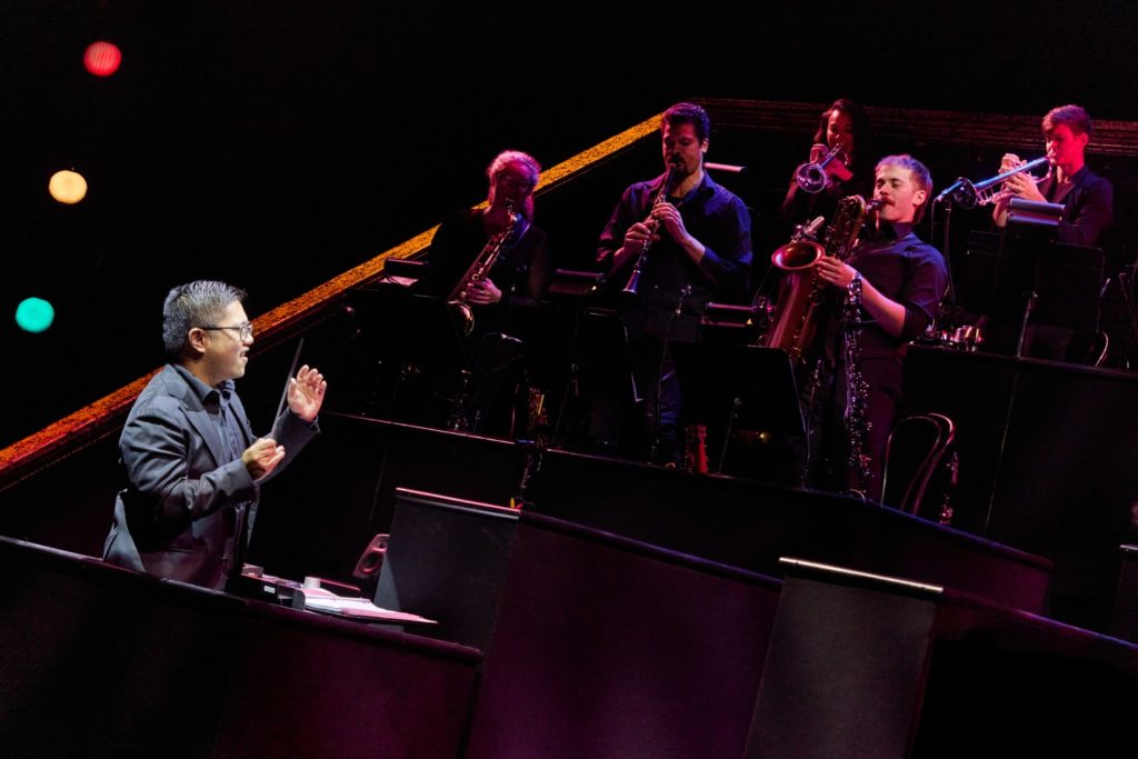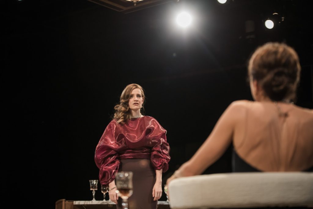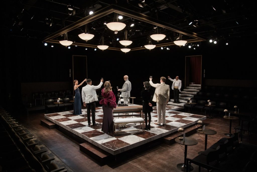 I was particularly struck by the stage design’s tiled chessboard pattern, which cleverly alluded to the mind games and strategic maneuvering among characters to “win” more money. Surrounding the stage were nightclub-style tables, where audience members could order refreshments via QR code, while the remaining spots were mostly traditional theatre seating. Except two rows were transformed into a raised cocktail-style viewing bar (also with QR codes) for those who preferred the ambiance of the nightclub tables with a less intimate view. It was a creative choice that truly “elevated” the experience, even if it meant sacrificing a row of potential tickets.