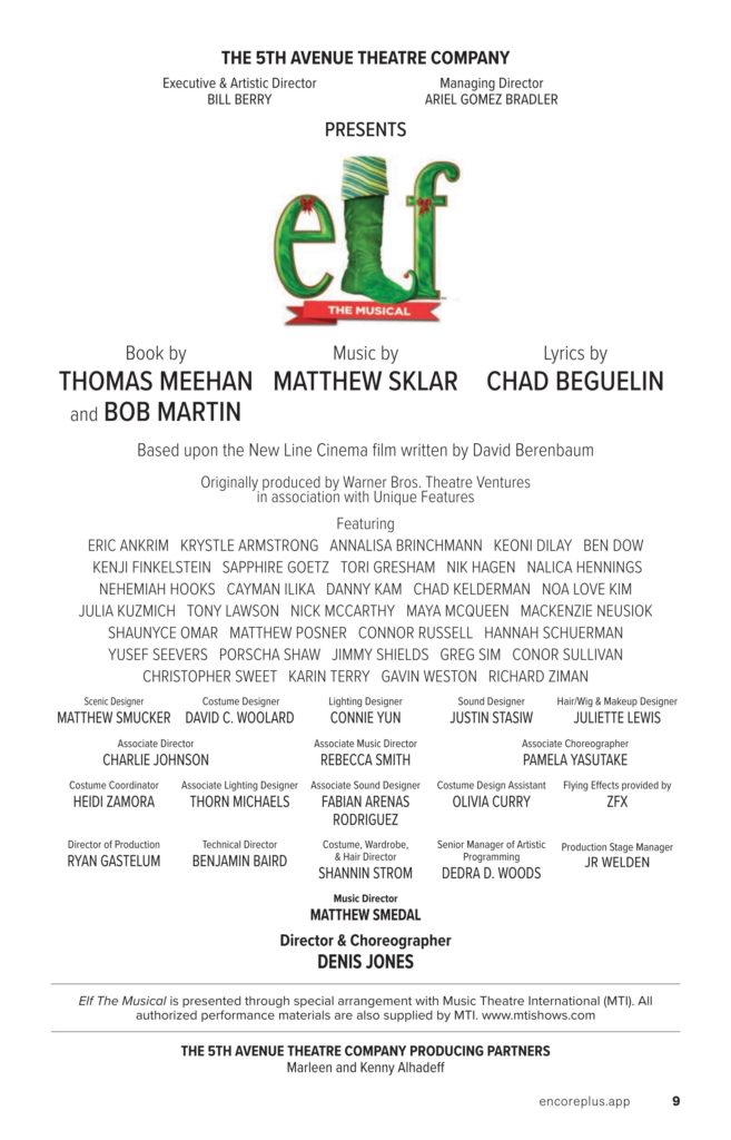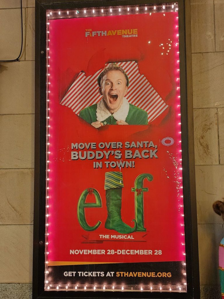 Elevator Thoughts (aka Tweet): Elf: The Musical at The 5th Avenue Theatre is pure holiday cheer. A swinging live orchestra (led by Matthew Smedal) delivering that classic big-band Broadway showbiz sound and all the sparkle of an NYC Christmas. A joyful, festive escape starring Eric Ankrim.