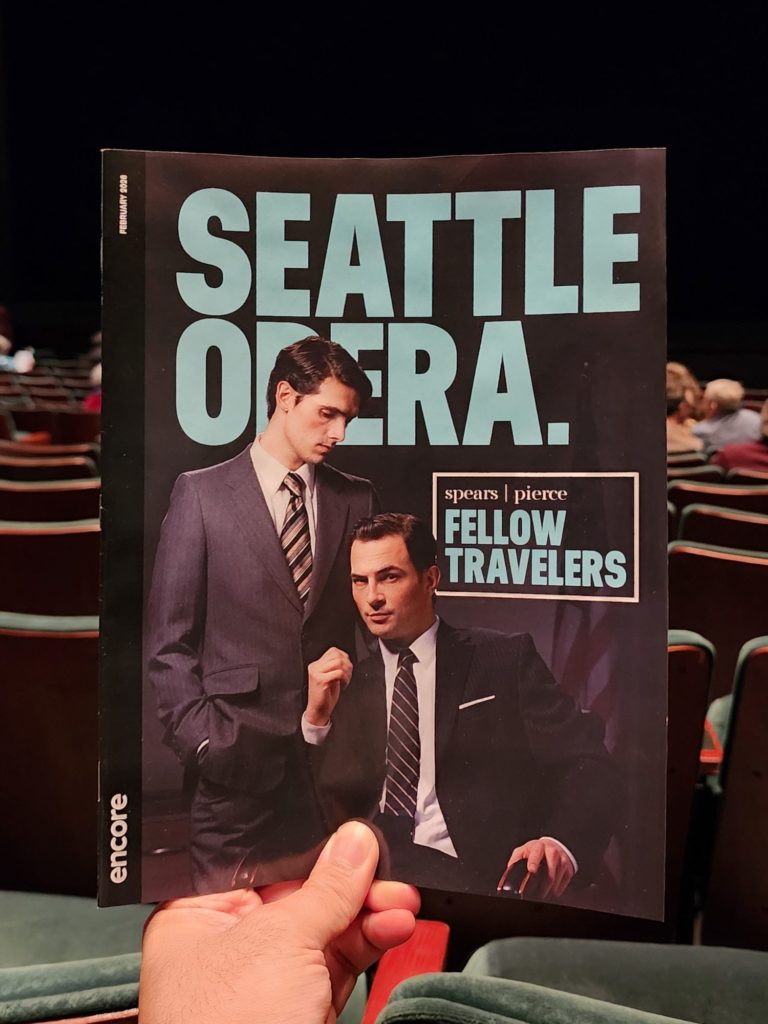 Elevator Thoughts (aka Tweet): Happy opening night to Fellow Travelers by Seattle Opera accompanied by Seattle Symphony. Refreshing to see a gay romantic love story at the center of the stage. Narratives like this are still rarer than they should be. Starring Jarrett Ott / Joseph Lattanzi and Colin Aikins / Andy Acosta.