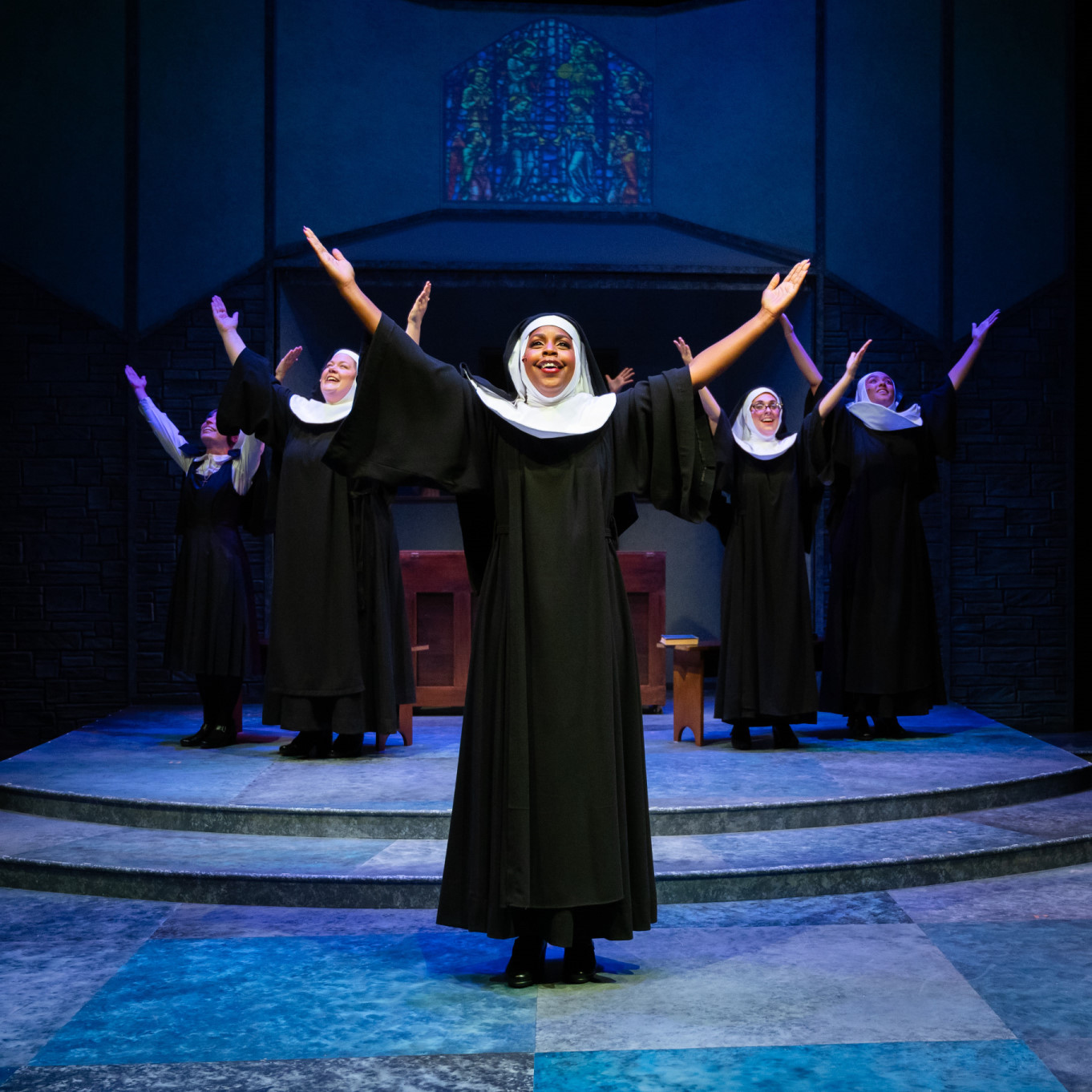 Alexandria J. Henderson in SISTER ACT at Taproot Theatre, with Rebecca Cort, Hannah Schuerman, Cherisse Martinelli, and Ania Briggs. Photo by Robert Wade.